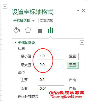 5.选择顶部的次要横坐标轴,在“设置坐标轴格式”窗格中依次选择“坐标轴选项→坐标轴选项”,在“边界”中设置最小值为“1”,最大值为“2”。
