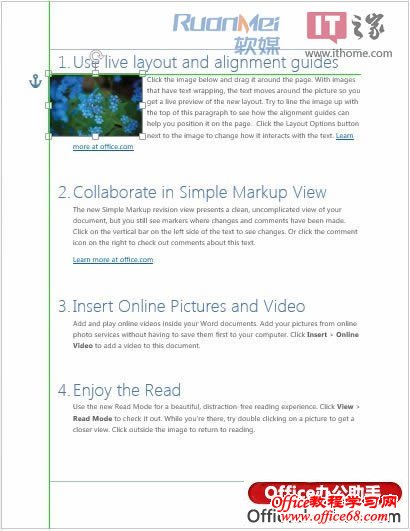 Word 2013还有一个新功能是实时布局(Live Layout)。它可以将图片放置在设定位置前进行更好的预览。微软称:“在新版Word中,当你移动浮动图片时,你会看到文本布局的实时变化,这样您就可以一次就把图片放到设定的文章中。实时布局功能也可以调整浮动图片的大小或旋转图片,同时还可调整表中的行和列。”