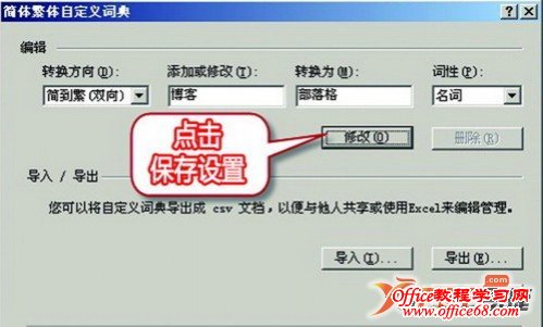 3、点击自定义词典后,在添加或修改及转换为两处填好自定义的词语就可以了,很简单的。