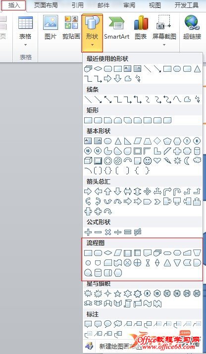 1、Word2007与2010:插入—形状—流程图,选择自己需要的形状并单击,然后在页面上设定好的位置用鼠标画出形状;