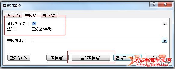 2、在查找内容处输入“^p”,点击全部替换,隐藏全文回车符;