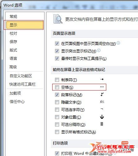 3、“格式标记”区域中的“空格”复选框,取消选择,确定,再返回到Word中就会发现所有小圆点都消失了。