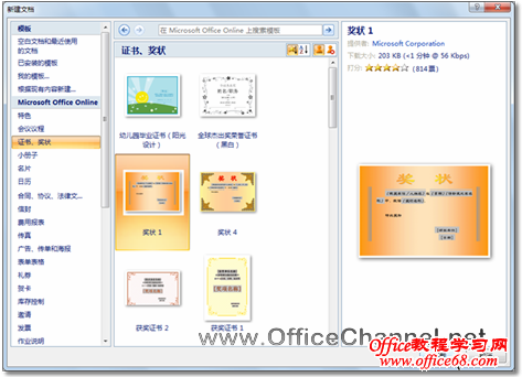 图1 执行【新建】命令 (2)随即将打开“新建文档”对话框,在左侧列表框的“Microsoft Office Online”区域中,选择“证书、奖状”,即可在该对话框中间的窗格中以缩略图形式查看来自Office Online网站的所有“证书、奖状”分类中的模板,如图2所示。选择满意的模板,并单击【下载】按钮。