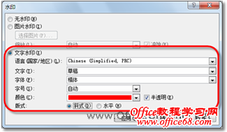 图4 自定义的图片水印 如果要为文档添加自定义的文字水印,则需要在“水印”对话框中选中“文字水印”单选按钮,其下方的各选项变为可用,根据需要进行相关设置。可在“语言(国家/地区)”下拉列表框中选择语言种类;在“文字”下拉列表框中选择已有文字,也可直接输入相应文字,如“草稿”;设置文字的“字体”、“字号”、“颜色”、“版式”等(如图5所示),最后单击【应用】或【确定】按钮,即可在文档中添加该文字水印,效果如图6所示。