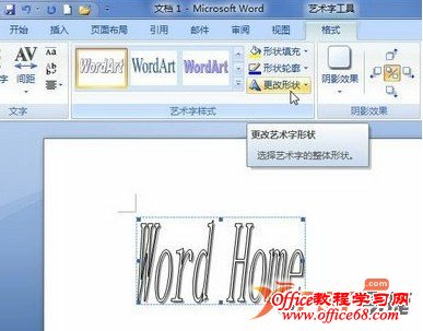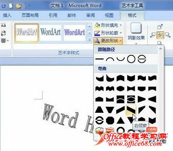 2、【艺术字工具】【格式】【艺术字样式】,单击【更改形状】按钮,设置艺术字的形状。