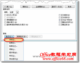 图2 输入要查找的文字 (3)单击【更多】按钮,展开更多设置选项,在“替换”选项区域中单击【格式】按钮,在下拉列表中执行【字体】命令,如图3所示。