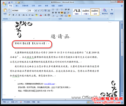 在有些情况下,我们可能需要向大量人员发送内容相同或相似的邮件,这些邮件有时仅仅是称呼不同而已,如果逐一编写所有邮件,即使是通过复制、粘贴的方式,也将花费大量的时间,有没有其他方法快速编写并发送这样的邮件呢? 名为“客户信息”的工作簿中保存了所有客户的联系信息,其中包括客户姓名、性别、联系电话、电子邮件等字段。现在需要向所有客户发送一封邀请函,不同邀请函的内容都是相同的,只是称呼有所不同,为了表示诚意,我们希望每封邮件都带有“尊敬的方文成先生”、“尊敬的林丽莉女士”等字样,此时可以按照如下步骤进行操作。 (1)新建Word文档并编写邀请函内容,称呼部分可暂时用占位符代替,例如“尊敬的【姓名】【先生/女士】”,如图1所示。