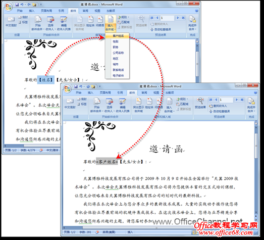 图4 将“【姓名】”占位符替换为合并域中的“客户姓名” |