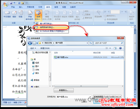 图1 编写邀请函内容 (2)在“邮件”选项卡的“开始邮件合并”选项组中,执行“选择收件人”下拉列表中的【使用现有列表】命令,打开“选取数据源”对话框。导航到“客户信息.xlsx”工作簿所在位置,并将其选中,如图2所示。