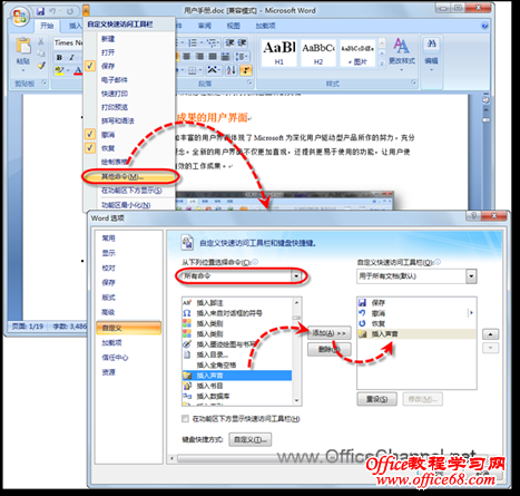 1)单击快速访问工具栏右侧的【自定义快速访问工具栏】按钮(),在随即打开的下拉菜单中,执行【其他命令】命令,打开“Word选项”对话框。