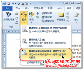 图1 审阅选项卡 2. 然后在“语言”选项组中单击【翻译】按钮,并执行下拉列表中的【翻译屏幕提示】命令,即可快速启动屏幕取词翻译功能,如图2所示。