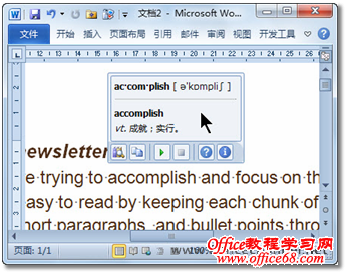 图2 翻译屏幕提示 自动取词并翻译 在Word 2010文档中启动“屏幕取词翻译”功能后,小刘便可在文档中移动鼠标到相应字词上,系统将自动取词并显示翻译提示框。 1. 在文档中,将鼠标移动到需要进行翻译的英文单词上,就会立即显示一个半透明的翻译提示框,如图3所示。