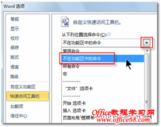图3 打开快速访问工具栏视图 4. 在“从下列位置选择命令”下拉列表框中,选择“不在功能区中的命令”选项,如图4所示。