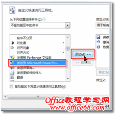 图4 选取不在功能区的命令 5. 在“不在功能区中的命令”列表中,向下滚动垂直滚动条,找到并选中“发送到Microsoft PowerPoint”命令,然后单击【添加】按钮,如图5所示。
