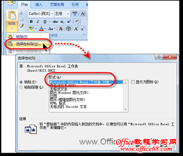 图1 将数据内容复制到Office剪贴板 (2)在目标Word文档中,切换到“开始”选项卡,单击“剪贴板”选项组中的【粘贴】按钮的下三角按钮,并执行【选择性粘贴】命令。然后,在“选择性粘贴”对话框的“形式”下拉列表框中,选择“Microsoft Office Excel工作表对象”,如图2所示。