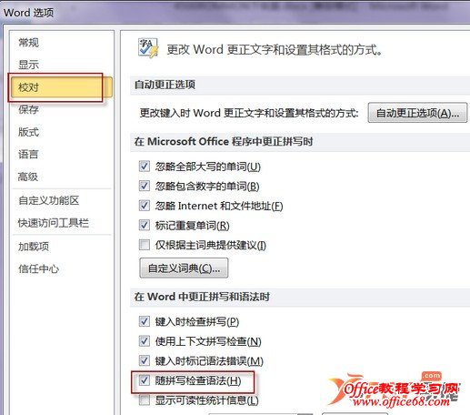 单击【文件】【选项】,打开Word选项的【校对】选项卡,取消对“随拼写检查语法”的勾选,最后单击【确定】,保存设置。