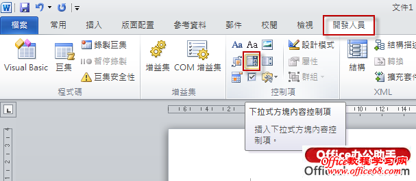 2. 切换到 [开发人员] 索引标籤,下拉控制项位于 [控制项] 分类中。
