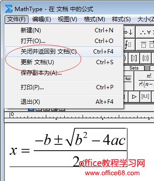 第四步 编辑完成后,点击“文件”-“更新到文档”或者“关闭并返回文档”,公式就已经自动插入到Word 2010中了。