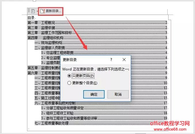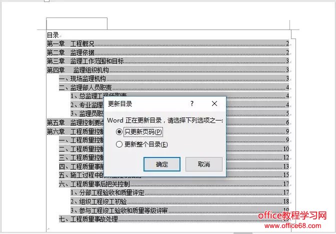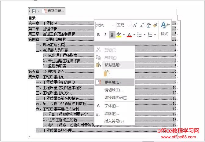 将鼠标光标置于目录中,单击鼠标右键,在弹出的快捷菜单中选择“更新域”命令,同样打开”更新目录“对话框,按需选择后“确定”即可完成对目录的更新。
