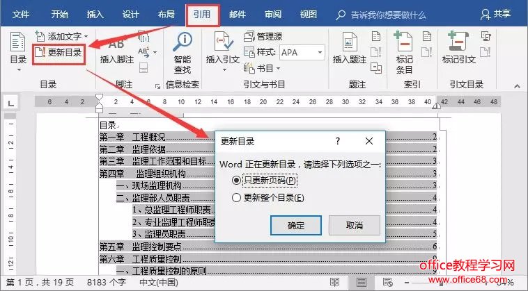 点击【引用】-【目录】-【更新目录】按钮,打开“更新目录”对话框,选择”只更新页码“或”更新整个目录“选项,完成后单击“确定”即可完成目录的更新。
