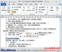 浮动工具栏是Word2010中一项极具人性化的功能,当Word2010文档中的文字处于选中状态时,如果用户将鼠标指针移到被选中文字的右侧位置,将会出现一个半透明状态的浮动工具栏。该工具栏中包含了常用的设置文字格式的命令,如设置字体、字号、颜色、居中对齐等命令。将鼠标指针移动到浮动工具栏上将使这些命令完全显示,进而...