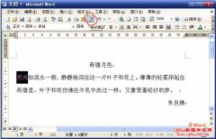 在word2003中设置文字的字体、颜色等格式,如果需要设置许多相同的效果,我们可以使用格式刷 ,用它来复制格式。 一、打开一篇word2003文档。选中文中的月光,把颜色设为绿色,然后点一下工具栏上的格式刷 ,如图一。格式刷外面出现一个蓝框 ,表示处于可用状态,鼠标指针上也有一个刷子。 图一 格式刷 二、在流水上拖动鼠...