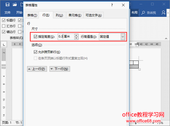 ![]() (3)再次单击鼠标右键,在弹出的快捷菜单中选择“表格属性”命令,在打开的对话框中选择“行”选项卡,勾选“指定高度”复选框,设置高度为“0.3厘米”,“行高值”设置为“固定值”,然后点击“确定”按钮。