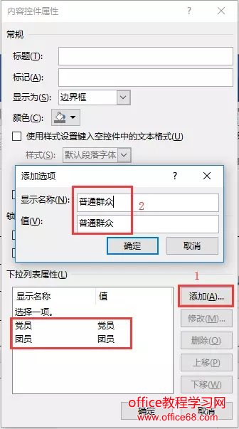 ![]() (3)打开“内容控件属性”对话框,点击“添加”按钮,在弹出窗口中,依次分别新增“党员”、“团员”和“普通群众”3个列表内容选项。