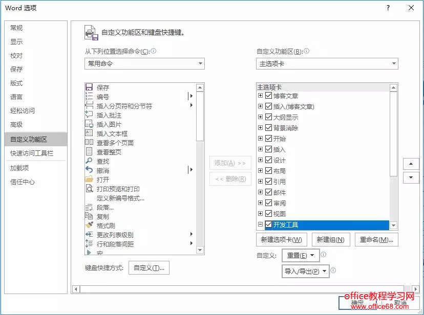 ![]() 技巧提示:如果菜单栏中没有显示“开发工具”选项卡。可在【开始】-【选项】-【自定义功能区】中添加“开发工具”选项。