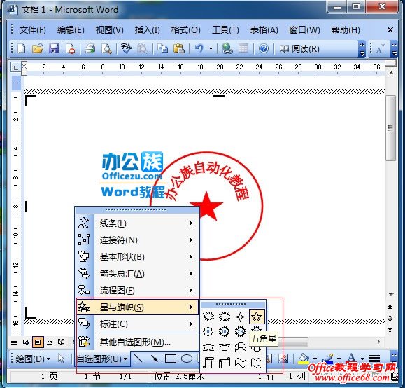 1 选择“自选图形—星与旗帜”里的“五角星”按钮,按住“Shift”键,拖动出一个正五角星。然后设置“线条”和“填充颜色”为“红色”。