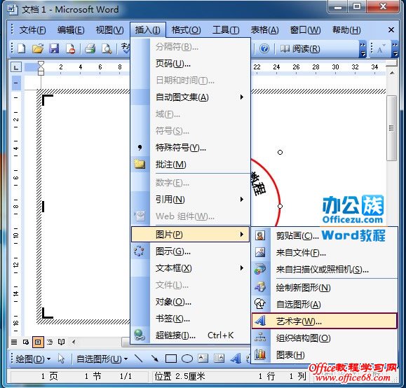 4 点击“插入”菜单,选“图片”中的“艺术字”一行三列,输入如:办公族自动化教程