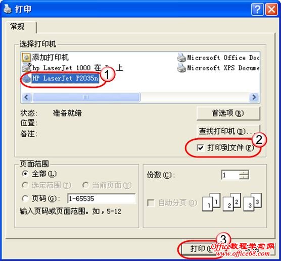 第三步:从打印机“名称”框中选择你刚才安装的那台“打印机”;选中“打印到文件”复选框,然后单击“打印”按钮。(图1)