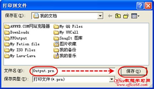 第四步:在“打印到文件”对话框中的“文件名”框中键入一个文件名,例如Output,文件的扩展名默认为prn,不用理会;然后点击“保存”。(图2)