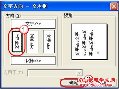 第三步:将光标定在文本框中,执行“格式→文字方向”命令,打开“文字方向—文本框”对话框,选中一种文字躺倒排列的方向样式,确定返回。(图3)