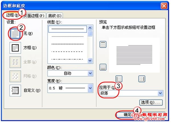 ●小提示:添加了页眉后,页眉处出现了一条横线,影响试卷的美观和制作,我们可以用下面的方法将其清除:在页眉处双击鼠标,再次进入“页眉和页脚”编辑状态,执行“格式→边框和底纹”命令,打开“边框和底纹”对话框,在“边框”标签下,选中“无”边框样式,然后将其“应用于”“段落”,确定返回即可。(图6)