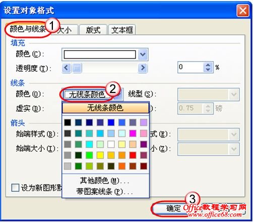 第四步:将文本框定位到页面左边页边距外侧,并根据页面的大小调整好文本框的大小及字符位置等。将鼠标移至文本框边缘处成“梅花状”时,双击鼠标,打开“设置文本框格式”对话框,在“颜色与线条”标签中,将“线条”设置为“无颜色线条”,确定返回。(图4)