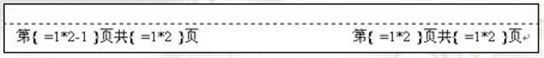 第二步:在左栏对应的页脚处设置页码。先输入字符“第”,按下“Ctrl+F9”组合键插入域记号(一对大括号{}),在大括号内输入“=”号,单击工具条的“插入页码”按钮,在后面输入“*2-1”字符,在大括号右外侧输入字符“页共”,按下“Ctrl+F9”组合键插入域记号,在大括号内输入“=”号,单击工具条的“插入页数”按钮,在后面输入“*2”字符,在大括号右外侧输入字符“页”。(图7左)