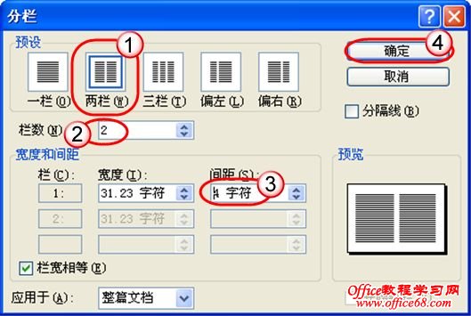 第一步:执行“格式→分栏”命令,打开“分栏”对话框,选中“两栏”样式,并调整好栏间距,确定返回。(图8)