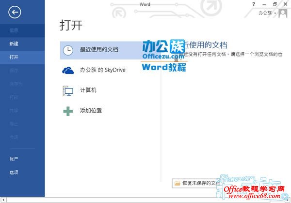 . Word2013进入后的界面“最近使用的文档”;