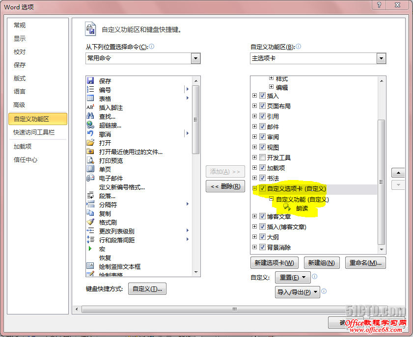 点击【文件】选项卡,选择【选项】,在【选项】对话框,选择【自定义功能区】,