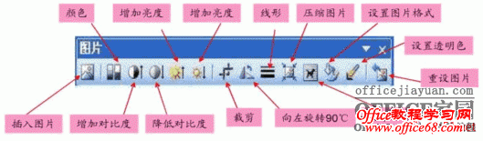 另,选择已插入的图片,单击鼠标右键选择“显示‘图片’工具栏”,可方便对图片进行修改。“图片”工具栏的功能详见下图。