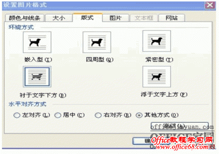 4.然后单击鼠标右键选择“设置图片格式”,在弹出的对话框中点“版式”菜单,选择“衬于文字下方”,点击“确定”。