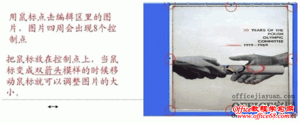 现在图片已经设置好了版式,如果图片并不完全在文字的下方,可以通过用鼠标拖动的方式将图片拖动到文字下方。如果图片过小或过大,可以通过图片四周的8个小圆点来对图片进行放大或缩小。