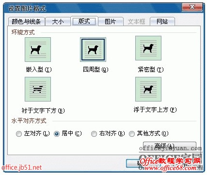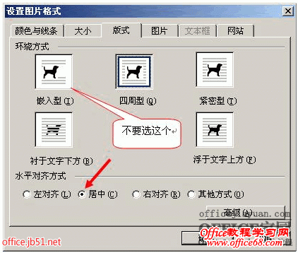 注:环绕方式为嵌入式时不可选则居中,其他方式(如四周型、紧密型)可以。当然了,最简单的办法还是直接用工具栏里的居中功能。
