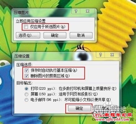 在弹出的“压缩图片”对话框中,确保“仅用于所选图片”未被选中,然后点击“选项...”打开“压缩设置”窗口,确保选中“保存时自动执行基本压缩”和“删除图片的剪切区域”两项,点击“确定”完成设置。保存保存文档。