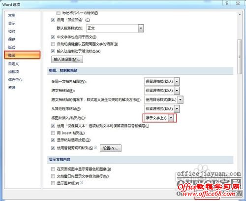 点击左侧的“高级”选项卡,在右侧找到“剪切、复制和粘贴”栏目,在“将图片插入/复制为”的右侧选择“浮于文字上方”,最后点击“确定”设置。