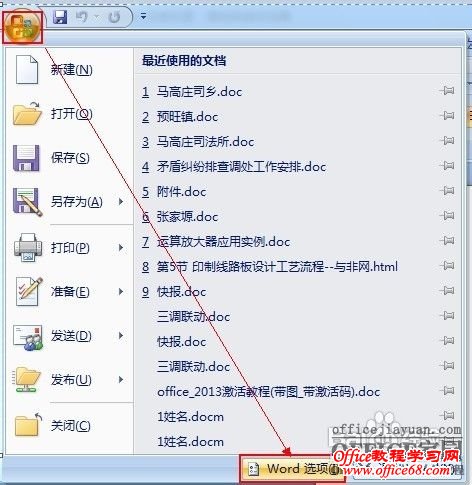 word2007版本中打开Word文档,点击“最左上角的Office的圆盘图标”→“Word选项”。