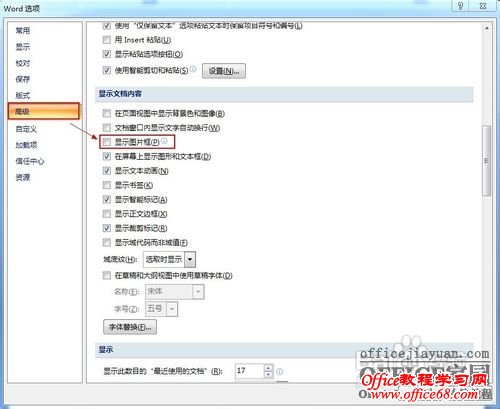 在打开的“Word选项”对话框中,点击左侧的“高级”选项卡,在右侧找到“显示文档内容”栏目,取消勾选“显示图片框”。