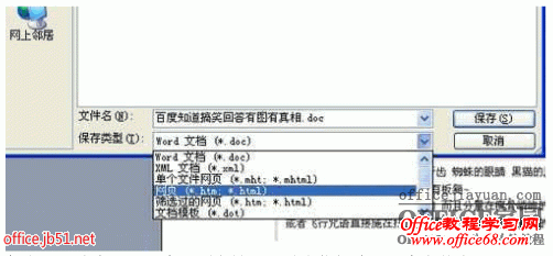点击word软件菜单中的“文件”选项,选择“另存为”或“另存为网页”,弹出对话框后,点击最下面的“保存类型”下拉菜单,选择“网页”,此时还可单击对话框中的“工具→Web选项”,设置图片的分辨率等,点击确定。