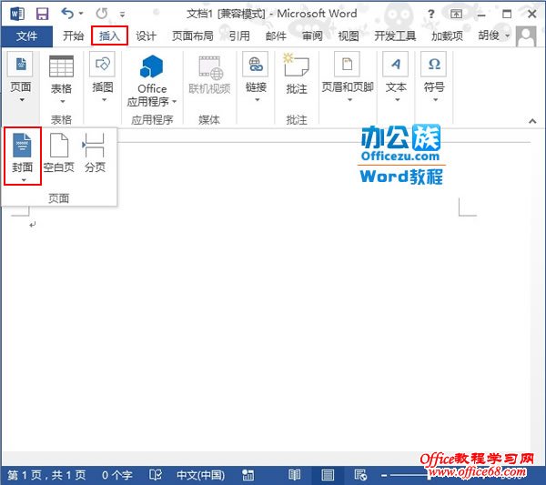 1 打开Word2013,单击菜单栏--插入--页面--封面。